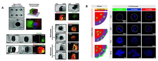 Figure 3. (A) Polarity induction in individual embryoid bodies (EBs) encapsulated in GelMA/PEG hybrid microgels with spatially patterned vasculogenic differentiation. All scale bars: 300 µm. Reproduced with permission from Ref. [57]. Copyright 2010 Wiley-VCH. (B) Bone marrow mesenchymal stem cell (BMSC) distribution in three gelatin/hyaluronic acid hybrid microgels with low, medium and high crosslinking densities. Reprinted from Ref. [58], Copyright 2020, with permission from Elsevier.