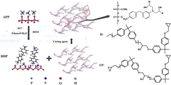 In general, intumescent flame retardants can be classified into additive flame retardants and reactive flame retardants. The additive intumescent flame retardant means adding flame retardants by physical blending into epoxy resin, which has poor compatibility with the unsustainable flame-retardant efficiency. The reactive intumescent flame retardant combines the surface group of flame retardant with the matrix through chemical bonds, which permits the retention of the flame retardant effect permanently. It has little influence on the original mechanical and thermal properties [10]. Ammonium polyphosphate (APP) has been widely used as an additive flame retardant in polymers thanks to its good char promotion and flame retardant properties. However, the compatibility between APP and the polymer matrix is poor, which leads to problems of precipitation, moisture absorption, and low flame retardant efficiency [11,12]. Improvement of the flame retardant efficiency and compatibility of APP with polymer materials has been variously reported. In past studies, a substance containing an amine group [13,14], organometallic framework [15], and bio-based resources [16] was used to modify APP. Among them, amine-containing modified APP has the characteristics of simple synthesis and good comprehensive performance, which provides a scheme for the synthesis of a high-efficient flame retardant with super performance. However, no study has reported that DDM could improve the flame retardant effect and compatibility of APP in epoxy resin.