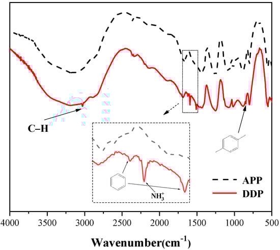 FTIR spectra of APP and DDP are presented in Figure 2. As shown in Figure 2, DDP has five new characteristic absorption peaks at 3027 cm−1, 1621 cm−1, 1592 cm−1, 1508 cm−1, and 846 cm−1 compared with APP. The characteristic peak at 3027 cm−1 corresponds to the stretching vibration peak of the C–H bond on benzene ring [17], and the peaks at 1614 cm−1 and 1508 cm−1 correspond to the characteristic stretching absorption of skeleton vibration of the benzene ring. In addition, the peak at 846 cm−1 and 1592 cm−1 corresponds to the 1,4 substituents on the surface of the benzene ring in DDM and the characteristic absorption peak of the –NH3+ structure. The peak at 1592 cm−1 is the characteristic absorption peak of the –NH3+ structure, exhibiting the existence of the reaction between DDM and APP [13]. It can be seen from the FTIR results that DDP has both functional groups of APP and DDP, which can preliminarily indicate the successful synthesis of DDP flame retardant.