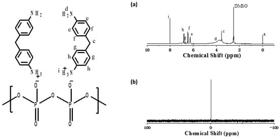 1H NMR and 31P NMR spectra of DDP are presented in Figure 3 in the 1H NMR spectrum of DDP. Moreover, the chemical shift at 8.2 ppm corresponds to the amino active hydrogen atom at the end of DDP [18]; the chemical shift in the range of 6.0–6.9 ppm is caused by the existence of hydrogen on the surface of the benzene ring structure. In Figure 3b, there is only one single peak at −0.6 ppm, which indicates that only one phosphorus-containing compound exists. NMR and FTIR spectra show that DDP was successfully synthesized.