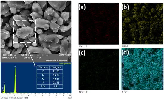 SEM-EDS analysis was used to investigate the morphology and element composition of DDP, and the SEM-EDS maps are presented in Figure 4. As shown in Figure 4, DDP causes obvious wrinkles on the surface of the APP owing to the adhesion of DDM, as supported by Zhao [19]. The contents of carbon, oxygen, and nitrogen elements, as well as phosphorus elements, in DDP (a, b, c, d) were distinguished through EDS. After the introduction of DDM, the carbon content of APP displayed an obvious improvement; the carbon element is evenly distributed on the APP surface, meaning that DDM is evenly distributed on the APP surface [20]. The above phenomena show that the DDP was synthesized as expected.