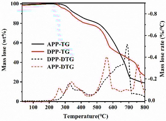 Thermal decomposition processes of APP and DDP are analyzed by thermogravimetric analysis. As shown in Figure 5, DDP shows four pronounced decomposition processes at 200~290, 290~450, 450~600, and 720~800 °C, respectively, while APP shows two obvious decomposition processes at 250~450 and 450~720 °C. Besides, the char yields of APP and DDP are 28.1% and 44.6%, respectively, at 800 °C, indicating that DDP presents better char-forming ability than APP.