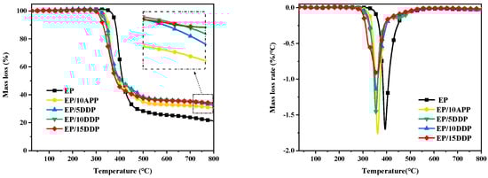TG test was used to evaluate the thermal behavior and char formation of flame retardant EP blends, and the curve is shown in Figure 6. As shown in Figure 6, all samples exhibit one degradation process, and the mass loss and mass loss rate of EP blends are lower compared with those of neat EP, indicating that the addition of DDP and APP weakens the thermolysis of EP blends.