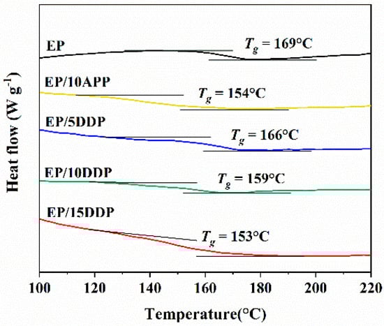 The glass transition temperature (Tg) of flame-retarded epoxy resin was measured by DSC analysis, and the results are shown in Figure 7. It can be seen that Tg of neat EP is 169 °C, and the glass transition temperature of epoxy resin decreased after introducing APP and DDP. Moreover, the Tg value of EP/10DDP is 5 °C higher than EP/10APP, which indicates that the modification process weakens the negative influence of flame retardant additives on the glass transition temperature of epoxy resin [23]. This may be caused by the reaction between –NH2 on the surface of DPP and epoxy groups, indicating that DDP has more satisfying compatibility in EPs than APP [24].
