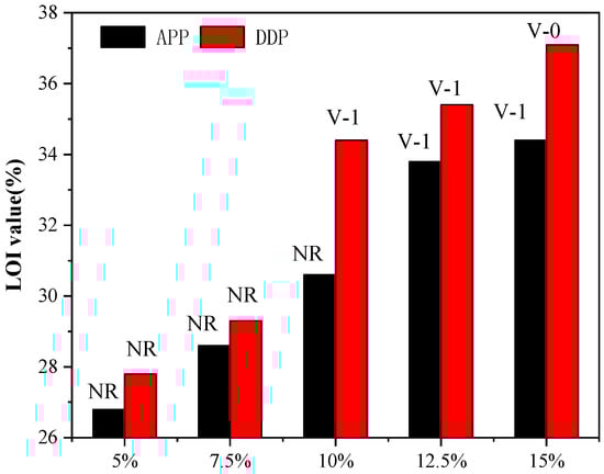 LOI and UL94 tests were used to evaluate the flame retardant properties of neat EP and EP blends; the results are presented in Table 1 and Figure 8. The LOI value of neat EP is only 26.3% and cannot pass the UL94 test. With the introduction of APP and DDP, the LOI value and the UL94 rating of EP blends were increased to different degrees. It should be noted that EP/10DDP has a higher LOI value and UL94 rating than those of EP/10 APP, indicating that DDP has higher flame retardant efficiency than EP/10APP in EP blends. Moreover, EP/15DDP exhibited excellent fire resistance with an LOI value of 37.1% and passing UL94 V-0 rating.