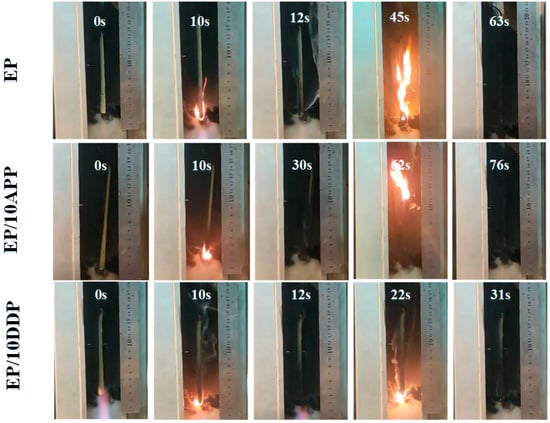 In order to further study the flame-retarded effect of DDP in EP, the digital photos of the burning process in the UL94 test are shown in Figure 9. After the first flame application, the flame of EP/10DDP extinguishes rapidly, while the flame of EP/10 APP lasts for a long time. After the second flame application, the flames of neat EP and EP/10APP spread to the upper end rapidly, and the neat EP burns out. However, EP/10DDP gradually decreases to extinction after burning for some time, indicating that DDP in epoxy resin has a better inhibitory effect on flame propagation than APP.