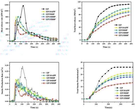 As shown in Table 3, TTI of the EP blends slightly decrease with the increase in APP and DDP loadings compared with neat EP, which is owing to the lower decomposition temperature of APP and DDP, as supported by the TG test. As shown in Figure 10, neat EP burns intensely after ignition and reaches the combustion intensity at about 125 s, accompanied by a THR value of 111.8 MJ/m2 and a PHRR value of 1186.7 kW/m2. With the incorporation of flame retardants, the THR values of EP/10APP and EP/10DDP reduce to 98.6 MJ/m2 and 86.3 MJ/m2, respectively, and PHRR values reduce to 866.1 kW/m2 and 753.4 kW/m2, respectively, suggesting that both APP and DDP could improve the flame retardancy of epoxy resin. Compared with APP, the same addition of DDP imparts better flame retardancy to the EP, while the THR and PHRR values of the EP/15DDP sample reduce by 32.3% and 40.8%, respectively, compare with neat EP.