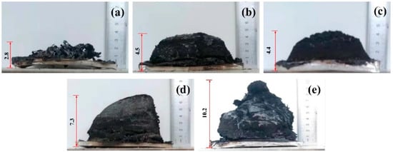 Figure 11 shows the char residues obtained after the cone calorimeter test. As shown in Figure 11, the char residue of neat EP has a height of 2.8 cm and its morphology is cracked, while flame-retarded EP blends generate a considerable volume of intumescent char layer. It can be found that the char layer formed by EP/10DDP is 2.8 cm higher than EP/10DDP, which indicates that DDP in EP blends has better char-forming ability. Moreover, the increase in char height is accompanied by the increase of DDP content, and the char height of the EP/15DDP sample reached 10.2 cm.
