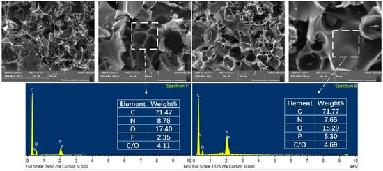SEM-EDS images of char residues of EP/10APP and EP/10DDP after the cone calorimeter test are presented in Figure 12. The EP/10APP char contains a large number of bubbles on the surface, which cannot effectively inhibit the diffusion of mass and heat. In contrast, EP/10DDP tends to form a more intact and continuous char layer with no cracks and fewer holes, thus exhibiting a superior barrier effect against fire. In addition, from the results of EDS mapping, it can be found that the content of phosphorus in EP/DDP char residue is higher than EP/10APP, which means more aromatization and crosslinking structures remained in the char layer [26]. Moreover, the C/O mass ratio of char residue is improved to 4.69 in EP/10DDP from that of 4.11 in EP/10APP, and a higher C/O mass ratio is beneficial to produce a char layer with better antioxidation property and denser structure [27].