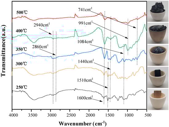 In order to investigate the reason for the high effectiveness of flame retardant of DDP, the FTIR spectra and the digital photos of EP/10DDP at different temperatures are shown in Figure 13. The peak at 1510 cm−1 corresponding to the NH3+ structure of DDP decreased gradually and then disappeared at 400 °C, indicating the decomposition of the NH3+ groups. Moreover, new peaks of P–N–C groups are observed at 1084 cm−1 and 741 cm−1 at 350~400 °C [28,29], and the formation of P–N–C is beneficial to enhance the thermal stability of char [30]. Besides, the new peak at 991 cm−1 corresponding P–O–C groups appeared at 400 °C, indicating the formation of phosphorus-rich crosslinking structures during combustion [9]. The absorbing peaks of –CH2 and –CH3 at 2860 cm−1 and 2940 cm−1 gradually disappeared, while the peaks at 1600 cm−1 assigned to C=C groups become wider, suggesting the appearance of C=C structures. In addition, the peak at 1440 cm−1 is assigned to the absorption peak of C–C groups in the aromatic rings, indicating the formation of aromatic structures. Overall, the char rich in P–O–C, P–N–C, and C=C groups contributes to enhancing the heat insulation property and antioxidant ability of the samples, thus endowing the sample with superior flame retardancy and smoke suppression properties.