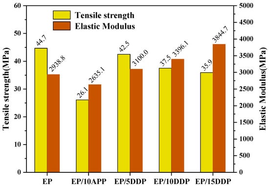 The mechanical property of flame retardant epoxy resin is shown in Figure 14. As shown in Figure 14, the tensile strength of EP blends gradually decreased with the introduction of flame retardant. It is obvious that the tensile strength of EP/10APP and EP/10DDP decreased by 41.6% and 16.1%, respectively, compared with neat EP, indicating that the same addition of DDP has a lesser negative influence on the EP blends compared with APP. In addition, the elastic modulus of EP blend with DDP is enhanced, while EP blends with APP show a downtrend, which is mainly related to the cross-linking reaction between amino groups on the surface of DDP and epoxy groups of flame-retardant epoxy resin, as supported by DSC analysis.