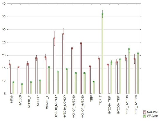 Solubility (SOL) and water absorption (WA) of native and modified maize starches (HVED10 = 10 min treatment with HVED; HVED30 = 30 min treatment with HVED; MONOP = Na2HPO4; TRIP = Na5P3O10; T = thermal treatment).