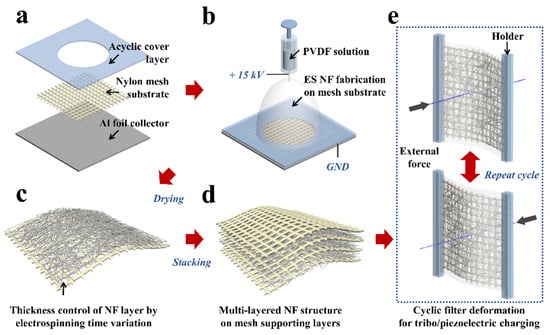 - Liu, H.; Zhang, S.; Liu, L.; Yu, J.; Ding, B. High-Performance PM 0.3 Air Filters Using Self-Polarized Electret Nanofiber/Nets. Adv. Funct. Mater. 2020, 30, 1909554. [Google Scholar] [CrossRef]