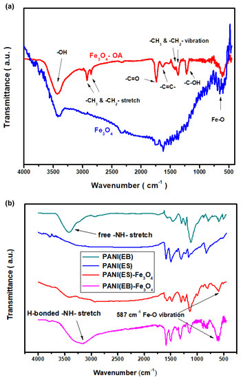 FTIR spectra of (a) Fe3O4 and Fe3O4(OA) (b) PANI and PANI/Fe3O4.