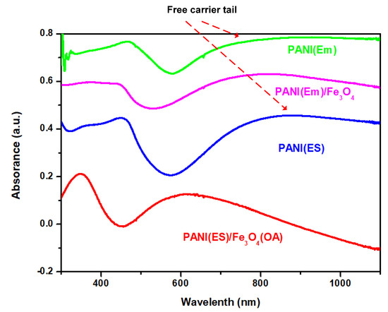 The UV spectra of neat PANI and composites prepared with either common or inverse emulsion polymerization are shown in Figure 2. For neat PANI(Em) and PANI(ES), the so-called ‘free carrier tail’ [28,29], which is related to the increase of the conjugation chain length and super red-shift to the near-IR region due to the more extended PANI molecules, is demonstrated in Figure 2. After Fe3O4 nanoparticles were incorporated in PANI, the tails in the near-IR region decayed and became curved for samples prepared by both regular and inverse emulsion. The bended curves of the composites indicate the shortening of the conjugation (blue shift). The extended PANI molecules recoiled back appearing like random coils than rigid rods. The coiling driving force could originate from the H-bonding between the hydroxyl groups of Fe3O4 nanoparticles and the amino groups of PANI. For PANI(Em)/Fe3O4 prepared with the regular emulsion approach, the H-bonding mainly occurred on the rigid rod surfaces, and the nanoparticles remained on the surface, as described in Scheme 2, since the hydrophilic Fe3O4 nanoparticles would remain in the water phase rather than penetrate in the core of the micelles where polymerization occurred (Scheme 2).