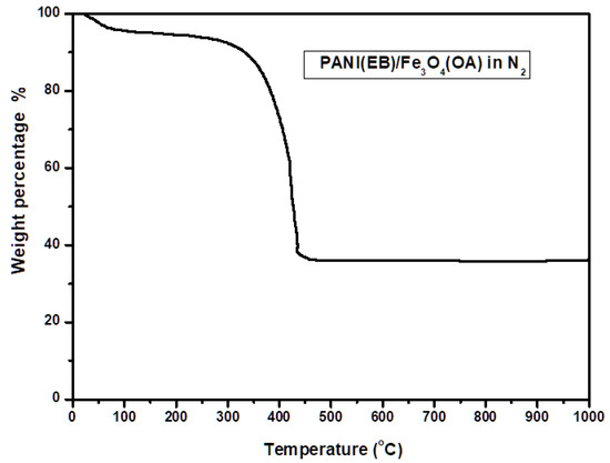 The mass loss percentages of PANI(EB)/Fe3O4(OA) upon calcination (thermal degradation) was monitored and recorded using TGA (TA SDT-2960, New Castle, DE, USA).