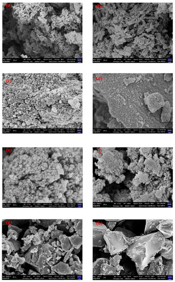 SEM micro-pictures of PANI and various iron compounds (a) PANI(Em) (b) PANI(Em)/Fe3O4 (c) Fe3O4 (d) Fe3O4(OA) (e) PANI(EB)/Fe3O4 (f) PANI(EB)/Fe3O4(OA) (g) FeNC (h) FeNC(OA).