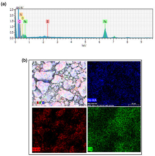 The EDS spectrum of FeNC(OA) and its element mappings are illustrated in Figure 6a,b, respectively. Figure 6a clearly demonstrates the presence of Fe, N, and C elements, C is the dominant element, and both Fe and N peaks are clearly seen. The sulfur element derived from KPS, which was converted to sulfate ion after initiating the polymerization of polyaniline. The element mappings demonstrated in Figure 6b revealed the presence of Fe, N, and C elements (in the form of α-Fe, Fe4N, or Fe3C), uniformly distributed in the carbonaceous matrix. The sulfur in Figure 6a came from the sulfate salt which formed from APS after initiating the polymerization of aniline salts.
