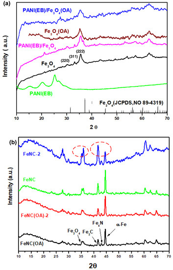 The X-ray diffraction patterns of neat PANI(EB) and nano-Fe3O4 compounds are displayed in Figure 7a, which demonstrates the crystalline patterns of polyaniline and Fe3O4 before and after mixing via polymerization. The pattern of neat Fe3O4 matches well with the standard pattern of Fe3O4 (JCPDS, No. 89-4319); smoother curves were found in the spectrum, indicating higher crystallinity. A clear pattern of peaks smaller than 30° (2θ) were seen for neat PANI(EB) due to the high degree of crystallization. However, peaks with some noise signals were present in the patterns of composite materials, especially after Fe3O4 was modified by OA before polymerization. Usually, Fe3O4 crystals are easily destroyed when a long-tail molecule like OA is attached on the surface, which might contribute to the imperfect diffracted pattern seen in the spectrum. Besides, no significant characteristic diffraction peak was found for PANI in PANI(EB)/Fe3O4(OA) composites, indicating that the crystalline structure of PANI(EB) in the PANI(EB)/Fe3O4(OA) was almost entirely demolished by the presence of Fe3O4(OA) nanoparticles in the micelles.