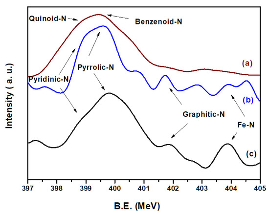 The XPS of N1s of neat PANI(EB), FeNC, and FeNC(OA) are illustrated in Figure 8 and characterize the possible N-containing products after calcination. In Figure 8a, no complicated N-related groups are seen, but quinoid-N and benzenoid-N are observed, which are connected alternatively to become PANI(EB). However, various N-containing groups [30,31,32] include pyridinic N (six-membered ring present in the edge), pyrrolic N (five-membered ring present on the edge), graphitic N (six-membered ring present in the middle of graphene-like matrix), and Fe–N emerged after calcination at 950 °C, and are depicted in the last portion of Scheme 3. Both FeNC (Figure 8b) and FeNC(OA) (Figure 8c) contain a large quantity of pyrrolic N and less graphitic N.