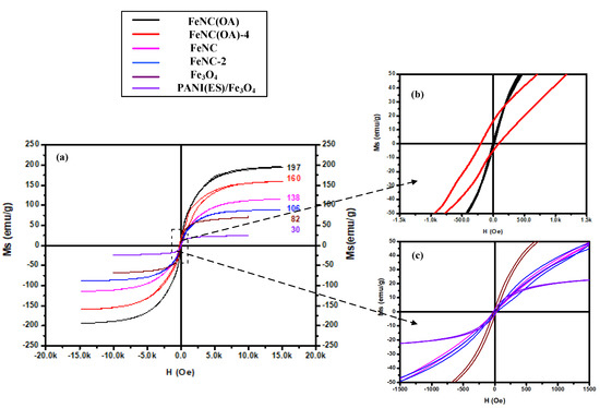 As expected, FeNC and FeNC(OA), which were obtained from the calcination of PANI(EB)/Fe3O4 and PANI(EB)/Fe3O4(OA) at 950 °C, respectively, demonstrated high saturated magnetization of 138 and 197 emu g−1 compared to 82 emu g−1 of neat Fe3O4 and 30 emu g−1 of PANI(ES)/Fe3O4, in accordance with Figure 9a. The high magnetic moment of FeNC and FeNC(OA) derived from the formation of both α-Fe and Fe3C, as already confirmed in the section of X-ray diffraction patterns. However, the Ms of FeNC decayed by 23.2%, from 138 to 106 emu g−1 in the air within two months, according to Figure 9a. For FeNC(OA), the decay was about 18.7%, from 197 to 160 emu g−1, still less than that of FeNC (23.2%) after a longer time (four months) at room temperature.