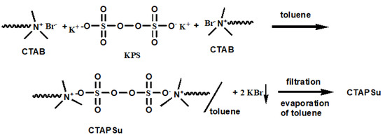 The hydrophobic persulfate initiators for inverse emulsion polymerization were prepared by dissolving CTAB in water through stirring for 40 min before introducing a double amount of KPS to the water mixture, which was stirred for additional 40 min and then poured into a large amount of toluene. The precipitated KBr was removed by filtration, and the toluene solvent was evaporated in a vacuum hood. Eventually, a CTAPSu cake carrying two long alkyl wings was obtained (Scheme 1). The obtained CTAPSu cake was dried in a vacuum oven overnight.