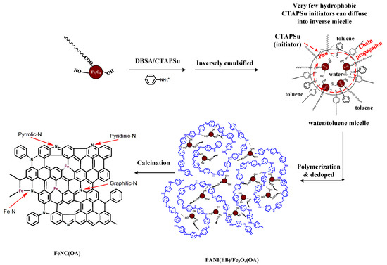 PANI(EB) is usually prepared with the common emulsion polymerization [11,12,13,14,15] method in the affluent water, where aniline monomers (anilinium) are soluble. However, nano-Fe3O4 obtained from the sol–gel approach carries hydroxyl groups on the surface and can disperse well in water as well. The hydroxyl groups of nano-Fe3O4 can firmly associate with anilinium monomers in water before polymerization. Eventually, the resultant PANI (polyaniline) molecules are fully covered with Fe3O4 nanoparticles. Furthermore, Fe3O4 nanoparticles would remain on the surface of the nanofibrous PANI molecules [16,17,18,19,20,21,22,23]. The high-magnetic-moment nanoparticles obtained after high-temperature calcination remain on PANI surface rather than covered by PANI can easily oxidize in the atmosphere, which results in the loss of the magnetic moment. To introduce precursor Fe3O4 nanoparticles in PANI before calcination, an inverse emulsion system was designed, so to constraint both nano-Fe3O4 and anilinium monomers in surfactant-stabilized micelles of water in affluent toluene. To minimize the number of initiator molecules into the micelles in order to increase the molecular weight (MW) of the resultant PANIs, water soluble KPS (potassium persulfate) initiators are both end-capped with CTAB (cetylammonium bromide), converting it into more hydrophobic CTAPSu (cetylammonium persulfate). In fact, without this transformation, most of the hydrophilic initiators (KPS) would enter into the water micelles, and the system would be similar to that for inverse-suspension polymerization, leading to polymers with a lower MW and reducing the area of PANIs, which can are able to cover by the magnetic particles. Therefore, most of theCTAPSu are soluble in the toluene phase due to the long aliphatic wings on both ends of the molecule and only few molecules will diffuse into the water-containing micelles in which Fe3O4 and anilinium monomers are present. Consequently, the polymerization can proceed with only a limited amount of initiators in the micelles to ignite the polymerization, and high-MW PANIs can be obtained, which can firmly cover Fe3O4 nanoparticles inside and well-protect the formed iron composites from oxidation after calcination. A nano-Fe3O4/PANI composite via regular emulsion polymerization was also prepared for comparison.
