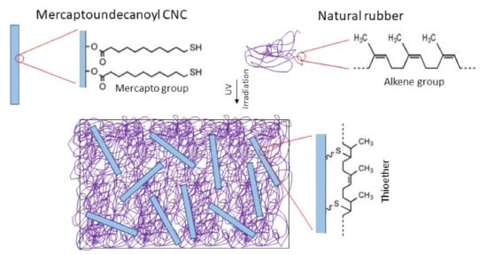 - Kanoth, P.B.; Claudino, M.; Johansson, M.; Berglund, L.A.; Zhou, Q. Biocomposites from natural rubber: Synergistic effects of functionalized cellulose nanocrystals as both reinforcing and cross-linking agents via free-radical thiol–ene chemistry. ACS Appl. Mater. Interfaces 2015, 7, 16303–16310. [Google Scholar] [CrossRef]