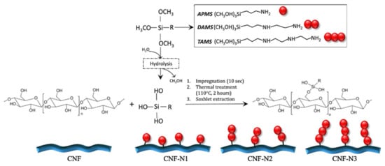 - Khanjanzadeh, H.; Behrooz, R.; Bahramifar, N.; Wolfgang, G.; Bacher, M.; Edler, M.; Griesser, T. Surface chemical functionalization of cellulose nanocrystals by 3-aminopropyltriethoxysilane. Int. J. Biol. Macromol. 2018, 106, 1288–1296. [Google Scholar] [CrossRef] [PubMed]