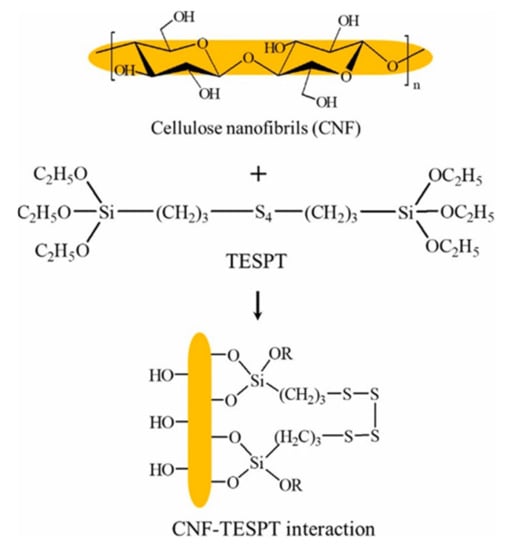 | Crystalline nanocellulose (CNC) from ramie fiber | Silylation—Different organosilanes: (3-Aminopropyl)triethoxysilane (APTES), 3-aminopropyl-triethoxysilane, bis[3-(triethoxysilyl)propyl] tetrasulfide (TESPT), (3-mercaptopropyl) trimethoxysilane (MPTMS) | Natural rubber (NR)/CNC nanocomposite at 2.5 and 5 wt% CNC content |