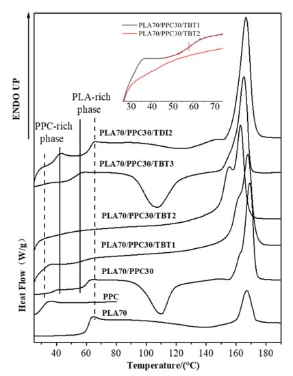 On the other hand, it can be seen from Table 3 that for the PLA70/PPC30 blend, the heat capacity for the PPC-rich phase is only one third of the neat PPC homopolymer, which is consistent with one third of PPC in the blend and suggests that PLA molecules in the PPC rich phase contributes little to the heat capacity at the glass transition temperature of PPC rich phase. However, the heat capacity for the PLA-rich phase changes very little compared with the neat PLA homopolymer (0.61 vs. 0.59) even though the PLA content is only 70% in the blend, meaning that the heat capacity of the PLA-rich phase is significantly larger than the neat PLA. The significantly larger heat capacity of the PLA rich phase likely associates with a significantly larger PLA segment motion at its glass transition temperature due to the inclusion of soft PPC molecules in the PLA rich phase. It can also be seen from Table 3 that for the incompatible blends with 1–2% of TBT, the heat capacity at glass transition for the PPC rich phase increases more than 20% compared with the blend without TBT, which can be attributed to significantly increased mobility of PPC segments due to PPC degradation. In fact, the heat capacity at glass transition for the PPC rich phase in the blend with 2% of TDI shows little change compared with the blend without TDI or TBT (Table 3), as no PPC degradation occurs when TDI is added into the blend. The blend with 3% of TBT is miscible and the heat capacity for the single glass transition is about the average heat capacity of PLA and PPC, evaluated based on the blend composition (Table 3). As also listed in Table 3, the heat capacity of PLA rich phase for the blends compatibilized with TBT or TDI is significantly smaller than the blend without TBT and TDI; this can be interpreted as follows. Much smaller and significantly more PPC domains are likely dispersed in the PLA matrix for the compatibilized blends, which may lead to more conformational constraints for PLA molecules, so that the mobility PLA segments is decreased at the glass transition of PLA rich phase. The heat capacity of the PLA-PPC miscible copolymer phase is 0.36 (J/g·°C, Table 3), which is also about the averaged heat capacity based on the estimated copolymer composition (30% PLA/PPC).