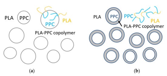 Schematic drawing of a small fraction of PLA-PPC block copolymer, obtained by the transesterification initiated with added TBT, act as the compatibilizer at the interface between PLA and PPC phases in PLA70/PPC30 blend with 1–2% of TBT (a), and the interphase between PLA and PPC phases, made of significant amount of PLA-PPC copolymer in PLA70/PPC30 blend with 2% of TDI due to the reaction of chain extension initiated by TDI (b).