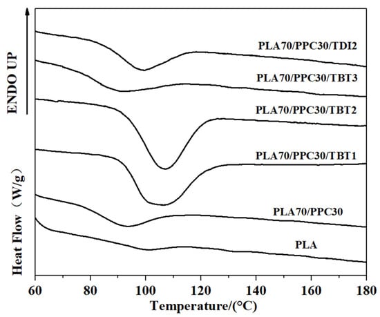 The subsequent heating the PLA, PPC and the blends are also investigated in the present work. The DSC melting thermograms are shown in Figure 3; the cold crystallization temperature (Tcc) of PLA component, its corresponding change in enthalpy (Hcc), the melting enthalpy of (Hm) of PLA crystals, as well as the crystallinity of PLA component are all listed in Table 5. As shown in Figure 3, the neat PLA exhibited a broad cold crystallization with a peak temperature near 140 °C as the crystallization during the cooling process is very limited. Compared with the neat PLA homopolymer, the cold crystallization peak of the PLA/PPC blend with 30 wt% of PPC is much better defined and shifts to a much lower temperature peaked at 110.2 °C, as also shown in Figure 3, likely due to the increased mobility of PLA component with the inclusion of soft PPC. Based on the melting, the crystallinity of the neat PLA is 7.31%, while it increases to 43.64% for the PLA component for its blend with 30 wt% of PPC, due to the increased mobility of PLA component with the inclusion of soft PPC.