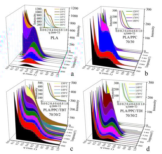 Selected in situ SAXS profiles during a cooling process at 4 °C/min of PLA (a), PLA70/PPC30 blend (b), PLA70/PPC30/TBT2 blend (c) and PLA70/PPC30/TDI2 blend (d).