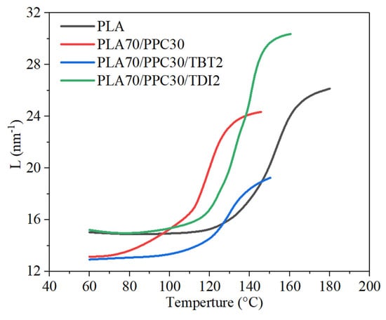 Long period (evaluated with Lorentz-corrected SAXS profiles) vs. cooling temperature during an in-situ DSC and SAXS cooling process at 4 °C/min of the neat PLA, PLA70/PPC30 blend, PLA70/PPC30/TBT2 blend and PLA70/PPC30/TDI2 blend.