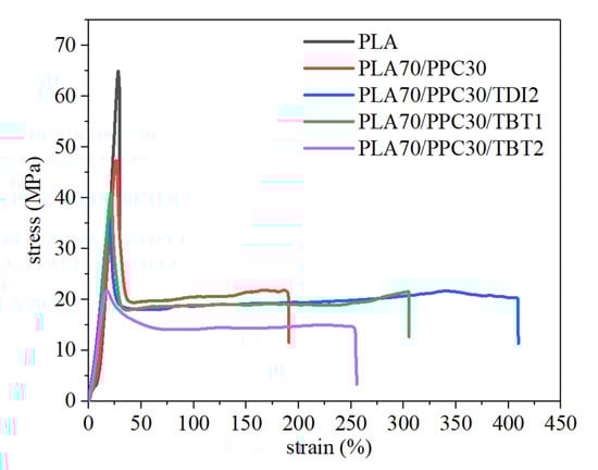 Tensile curves of PLA and PPC, its blend with PPC and the blends with 1–2% of TBT or 2% of TDI.