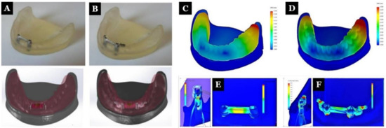 Real and computer models of the first studied system I (A) and the second studied system II (B). Distribution of displacements in an overdenture when an incisor was loaded with a vertical force of 50 N in system I (C) and system II (D). Distribution of stress within an implant and precision element when an incisor was loaded with a vertical force of 50 N in system I (E) and system II (F) [37].