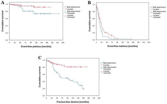 Results of Kaplan–Meier survival curves regarding patrix-related events (A), matrix-related events (B), and denture fracture (C) for locator and ball attachments [50].