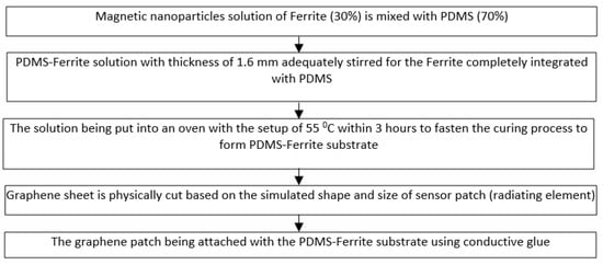Figure 2 explains in detail the processing steps (flowchart) for synthesizing the Magnetite PDMS Graphene array sensor. The PDMS used has the permittivity of 2.8 while the graphene used has the carbon content, thickness, and conductivity of 97%, 25 µm, and 3.5 × 108 s/m, respectively [32]. On the other hand, Figure 3 demonstrates the synthesized Magnetite PDMS Graphene array sensor.