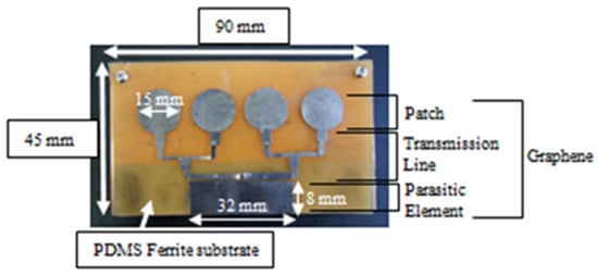 The magnetite PDMS Graphene array sensor is generally constructed of Graphene to form an array circular patch, incorporate a feeding line, parasitic element, and partial ground, as well as PDMS-Ferrite to form magnetite dielectric substrate. For simulation, Graphene has been set to 3.8 × 108 s/m for the conductivity value and PDMS-Ferrite is set to 2.6 and 0.01 for permittivity and loss tangent respectively. The array circular patch has been measured through specific calculation prior to being simulated using computer simulation software. Once being improved, the optimized patch size was determined at 15 mm in diameter. A 50 Ω microstrip line acts as feed source placed at the center right back of the patch for direct connection between the feed source and patch. In order to realize high gain sensor, a single circular patch is multiplied to produce a 4 × 1 array. A corporate feeding structure is applied by adding feedlines for the connectivity of each patch. Identical power delivery of all patches could be realized by applying a quarter-wave transformer impedance matching method. Hence, 100 Ω and 50 Ω feedlines are coordinated using quarter wave transformers of 70.71 Ω [30].