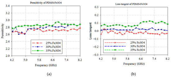 Figure 4. PDMS−Ferrite measurement results for permittivity (a) and loss tangent (b).