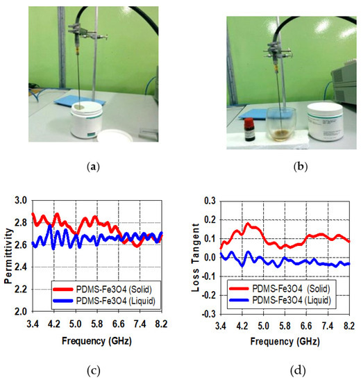Figure 5. PDMS-Ferrite measurement results for dielectric characteristic; (a) liquid state and (b) solid state, result of measured permittivity PDMS in liquid and solid cases (c), and result of measured loss tangent PDMS in liquid and solid cases (d).