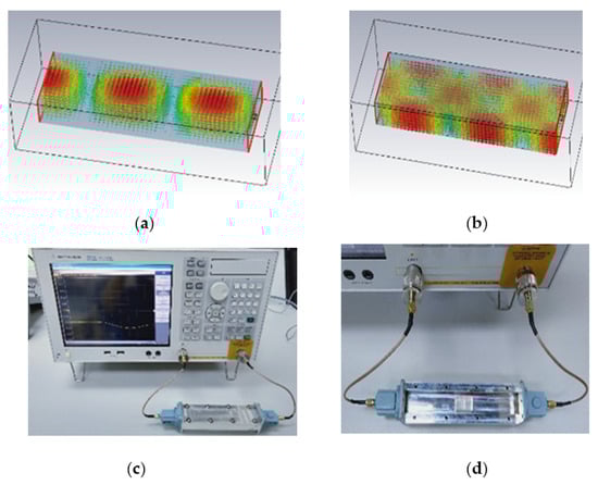 On the other hand, the waveguide approach is another method to determine PDMS-Ferrite permeability. Figure 6a illustrates how the approach applies the strong electric field at the waveguide center while Figure 6b shows the strong magnetic field at the waveguide wall. Hence, material permittivity and permeability will be dominant as the material located at the middle and at the side wall respectively during transmission coefficient (S21). Figure 6c shows the measurement setup, which consists of an adapter for the coaxial waveguide, network analyzer, and G-band waveguide (support frequency: 3.95−5.85 GHz), while Figure 6d indicates the location of sample for testing within the waveguide. Nevertheless, we failed to obtain a permeability calculation due to the extremely small reading of the sidewall, which resulted in an error through the transmission coefficient (S21). Thus, PDMS-Ferrite substrate electrical properties did not significantly alter with the presence of 30% magnetic Ferrite. Due to that, the determination of the permittivity value obtained by taking into account the permeability of the sample is the air permeability obtained through the fitting method [34].
