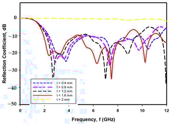 A study has been performed to investigate the optimum thickness of PDMS-Ferrite by varying the thickness of simulated PDMS-Ferrite in the range of 0.4–2.0 mm, as shown in Figure 7. Based on the reflection coefficient (S11) simulated results shown in Figure 8, the optimum thickness of PDMS-Ferrite substrate is 1.6 mm, as proposed in this paper due to the widest operated frequency (9 GHz) recorded, from 2.2 GHz to 11.2 GHz, as compared with the other operated frequency thicknesses.