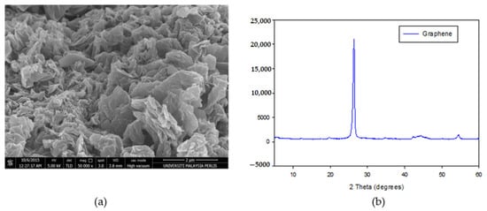 The FESEM image of graphene in Figure 9a illustrates the formation of scattered groups of graphene sheets with a clear sign stacking. The graphene sheets look like a layer sheet morphology more than the outsized area owing to the large surface to volume ratio. A similar morphological nature of the graphene as closely stacked due to the elimination of an oxygen group to form a closely associated stack arrangement [35]. Meanwhile, XRD patterns of graphene are presented in Figure 9b, where the most intensive characteristic peak observed at 26.60° corresponds to the (002) plane. This is clearly indicating the formation of pure graphite. As presented in Figure 9, the stacking sheets are closely linked to each other due to the interplanar distance and d-spacing reduction. The existence of graphene single layer structures and vanishing multilayer component will increase the greater spreading peak. The decreasing of the size of sheets with a shapeless arrangement is formed from a broad hump at 2θ = 20–30° [36].