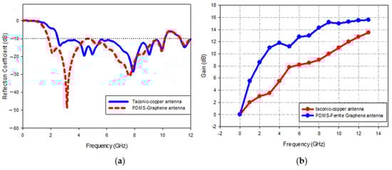 Fabricated sensors of the Magnetite PDMS Graphene array and Copper-Taconic are illustrated in Figure 11a,b correspondingly while Figure 12a,b presents the measured comparisons of S-parameters and gain of the two sensors. The proposed Magnetite PDMS Graphene array sensor operated within the frequency range of 2.2–11.2 (GHz) while Copper-Taconic resonates within the range of 4.2–11.2 (GHz). The gain of Magnetite PDMS Graphene array sensor is significantly higher (15.7 dB) than Copper-Taconic, which is 13.5 dB. The bandwidth and maximum gain of the Magnetite PDMS Graphene array sensor has been increased up to 28% (2 GHz) and 2.2 dB respectively. The ideal dielectric properties of low permittivity and low loss tangent of Magnetite PDMS-Ferrite as well as the high conductivity of graphene significantly contributed to the wide bandwidth and high gain of the Magnetite PDMS Graphene array sensor.
