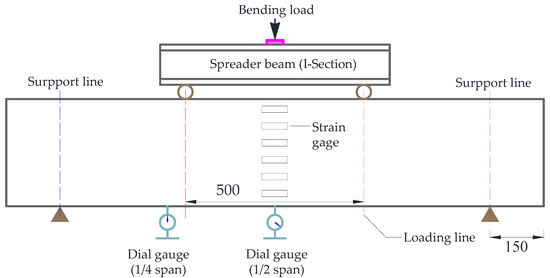 The reinforcement basalt fiber polymer-modified RPC beam were tested with reference to the specification “Standard for Test Methods for Concrete Structures” (GBJ50152-2012) [32]. Loading method adopts four-point bending loading, loading device selection the WAW-1000 kN type electro-hydraulic servo universal testing machine produced by Jilin Jinli test technology Co., Ltd. (Jilin, China). The experimental setup is schematically shown in Figure 3. Displacement and strain were measured by dynamic and static strain testing machine DH3817 and static strain testing machine DH3818Y produced by Jiangsu donghua Test Technology Co. (Jiangsu, China).
