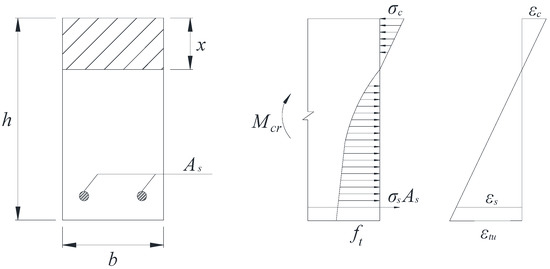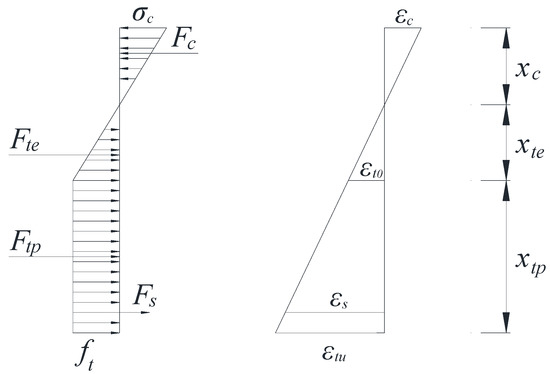 The stress distribution in the tensile zone was divided into the elastic and plastic tensile zones. The simplified calculation model of the normal section is shown in Figure 5.