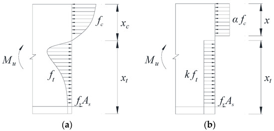 Similarly, the curved tensile stress diagram of the tensile zone is equated to a rectangular tensile stress diagram, and the stress height of the equivalent graph can be deduced backward from the equilibrium conditions and the test data. Equations (30) and (31) can be derived from the equilibrium conditions of forces and moments in Figure 7