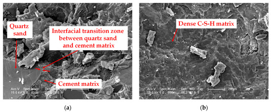 In this paper, basalt fiber treated with a coupling agent was used to modify the RPC material. Visualized scanning electron microscopy (SEM) was adopted to analyze the microstructure of basalt fiber modified polymer RPC, and the results are shown in Figure 8. Figure 8a shows that the thickness of the interfacial transition zone between the aggregate quartz sand and the cement matrix is negligible. Basalt fiber polymer-modified RPC replaces coarse aggregates in ordinary concrete with fine quartz sand, which eliminates mechanical, physical and chemical differences between normal concrete aggregates and mortar. As a result, the internal defects of basalt fiber polymer-modified RPC were reduced and the compactness was improved. From Figure 8b, it can be seen that the microstructure of basalt fiber polymer-modified RPC is denser and the hydration products are mainly dense C–S–H matrix. This is due to the fact that the basalt fiber polymer-modified RPC is cared for by heat treatment, which makes the hydration process more complete, changing the properties of the hydration products and reducing the porosity. It can be observed from Figure 8c that the basalt fibers are distributed in a random direction in the RPC material, and there is no agglomeration. Figure 8d reveals that the basalt fibers are tightly bonded to the cement matrix. These characteristics illustrate that basalt fibers form a tight monolith with the cement matrix, which can jointly withstand stress changes caused by external loads and temperature. The above-mentioned microstructural characteristics of basalt fiber polymer-modified RPC are important reasons for its excellent mechanical and durability properties.